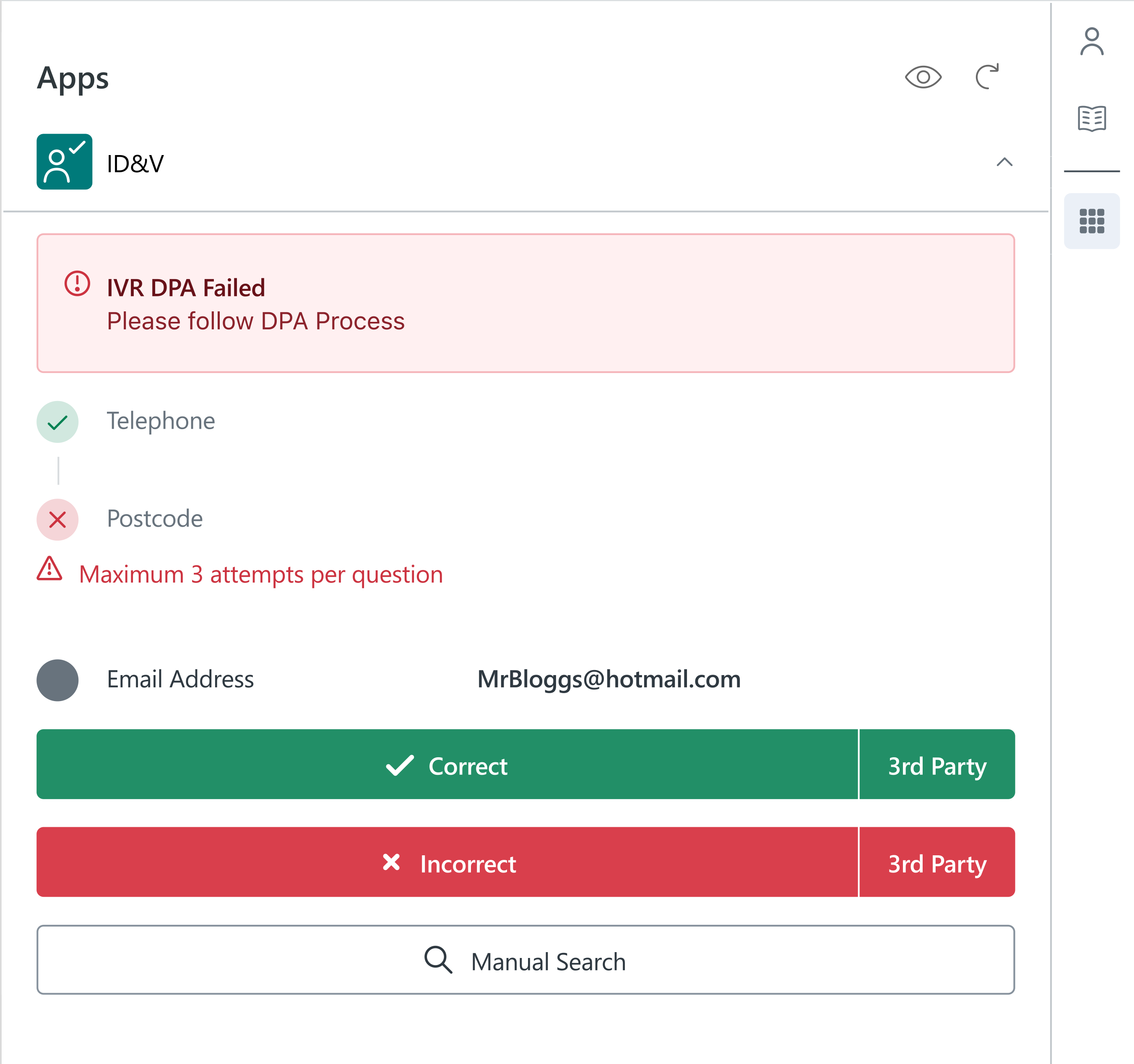 Confirm if the caller has confirmed the email address by selecting either Correct or Incorrect - select the 3rd Party option if you are not speaking to the account holder: