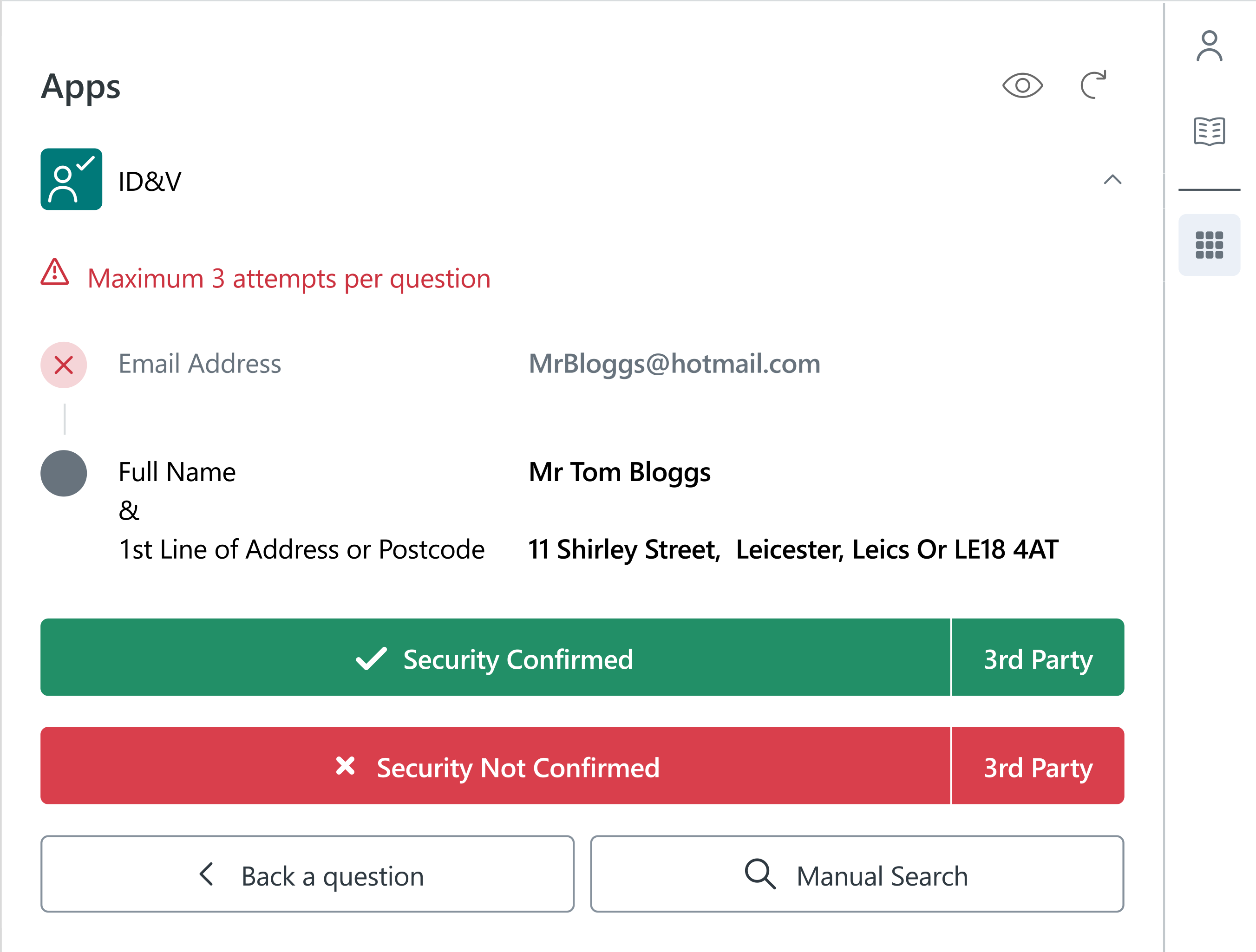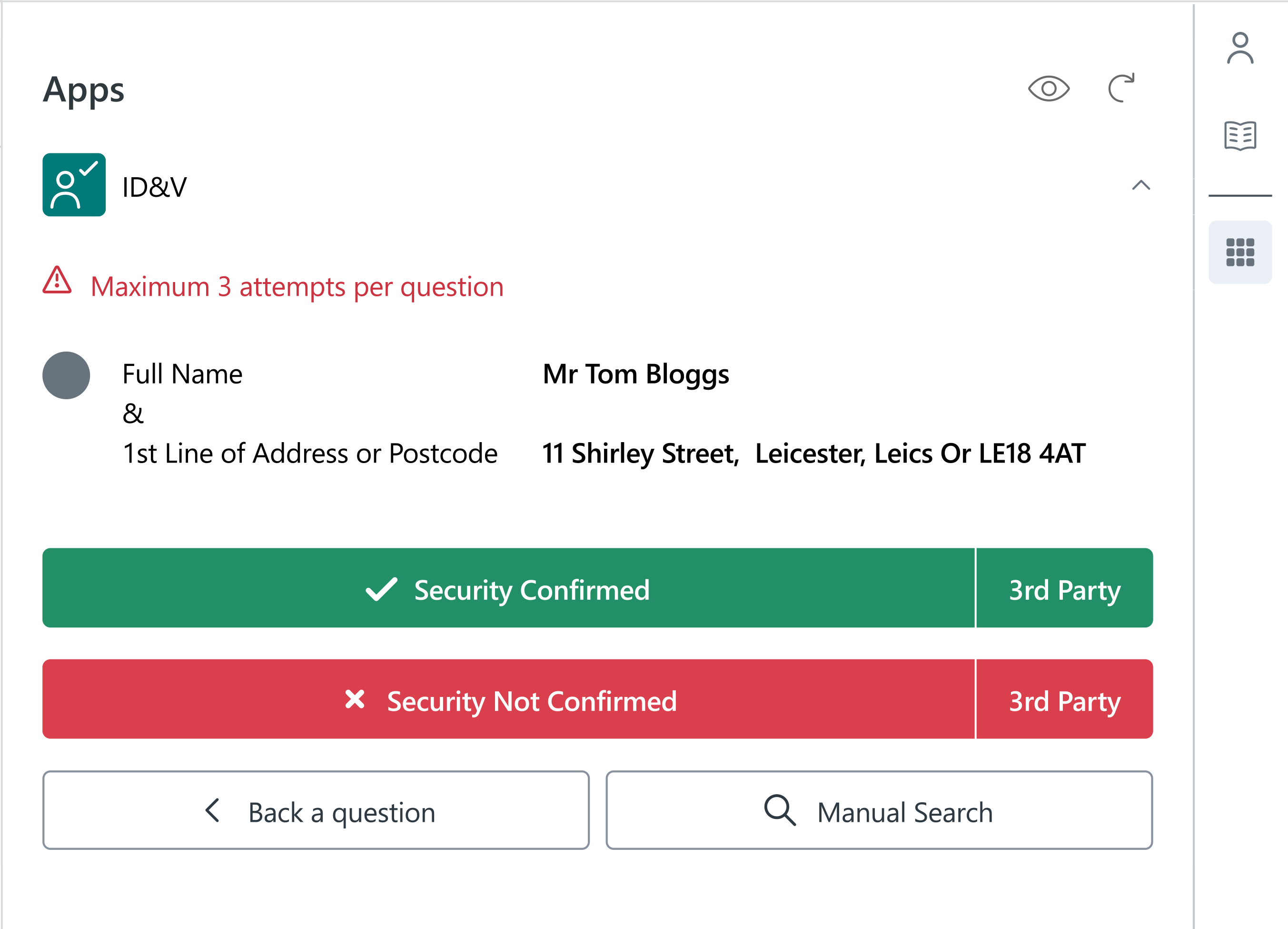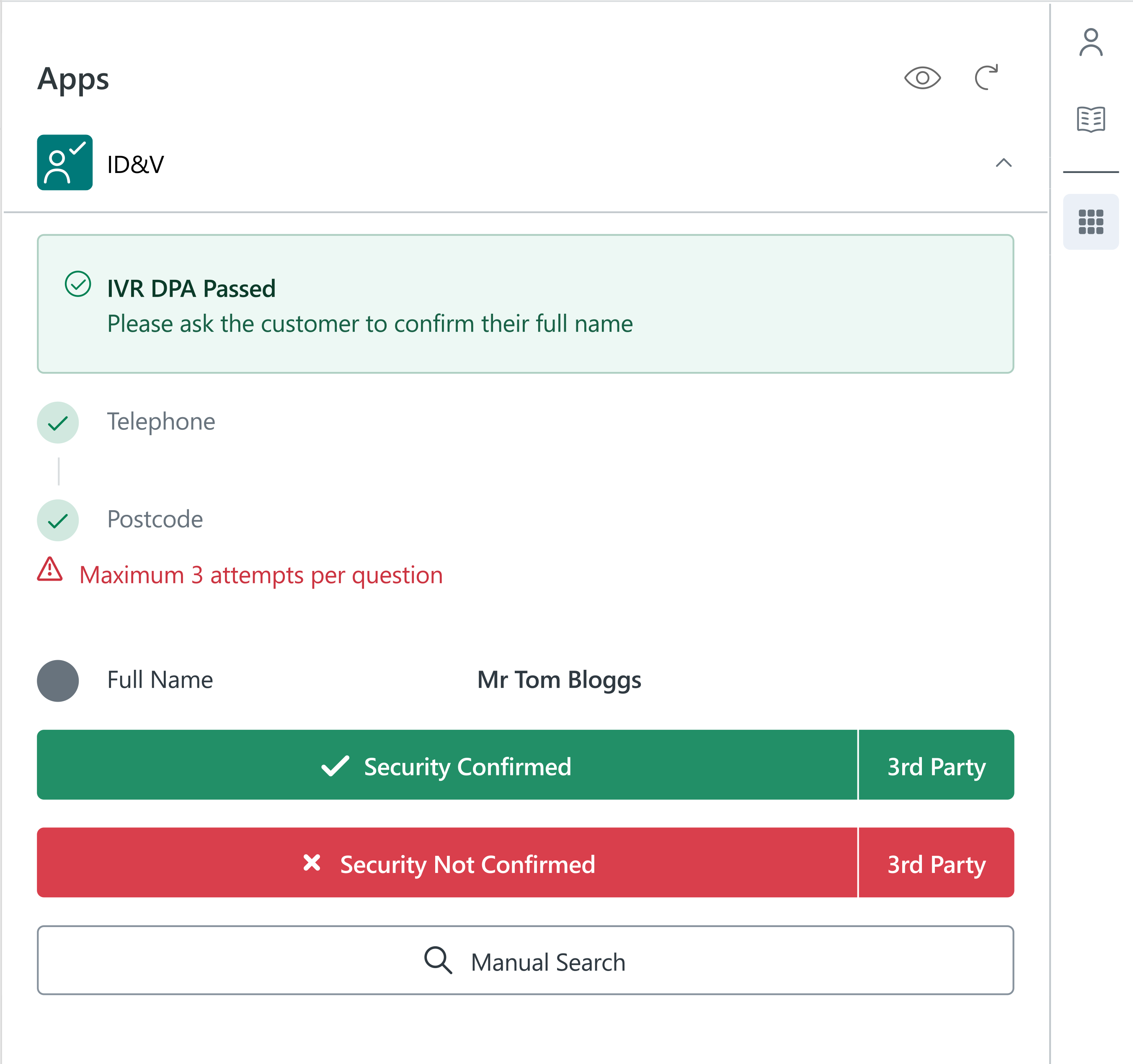 Ask the caller to confirm thefull name and 1st line of the address or postcode - they will have 3 attempts at the question: